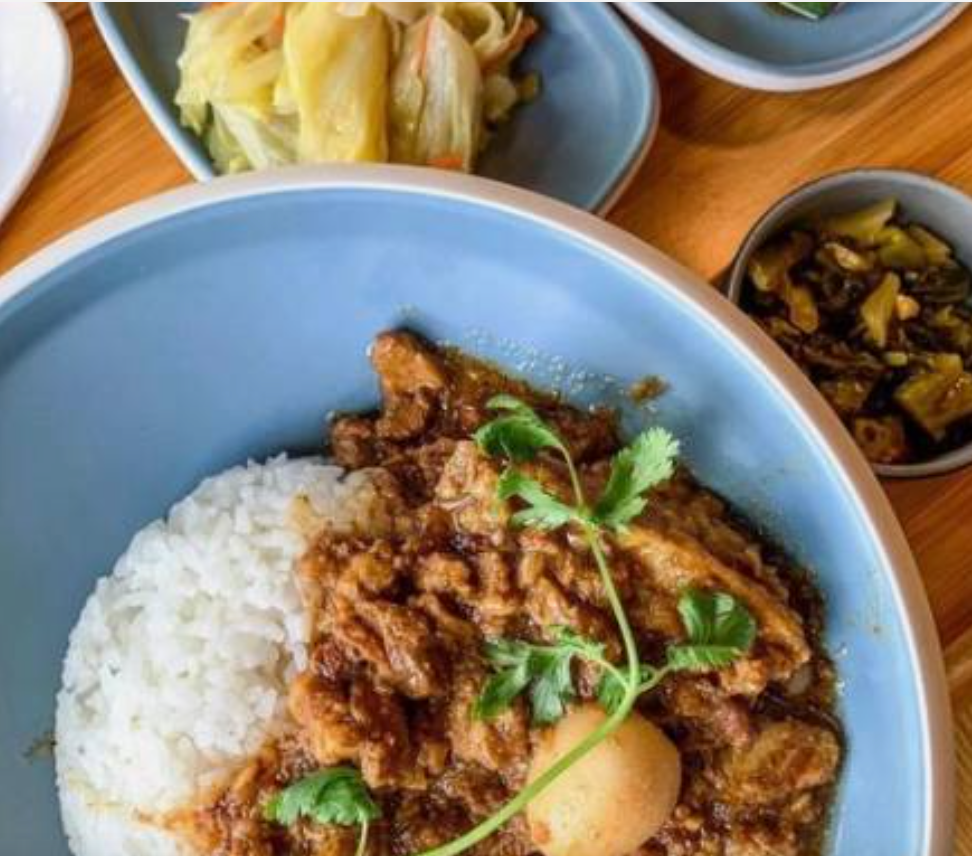 與細火慢滷,加入油蒜酥與蔥油酥增添層次。長時間滷煮使肉質軟